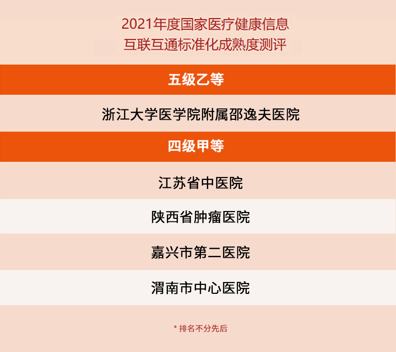 為促進健康中國建設,落實衛生健康信息化工作要求。近期,國家衛生健康委統計信息中心開展了2021年度國家醫療健康信息互聯互通標準化成熟度測評工作。由和仁科技服務支持的多家醫院通過國家醫療健康信息互聯互通標準化成熟度測評,其中,浙江大學醫學院附屬邵逸夫醫院成功獲評五級乙等,江蘇省中醫院、陜西省腫瘤醫院、嘉興市第二醫院、渭南市中心醫院順利通過四級甲等評測。在此,我們表示熱烈祝賀!