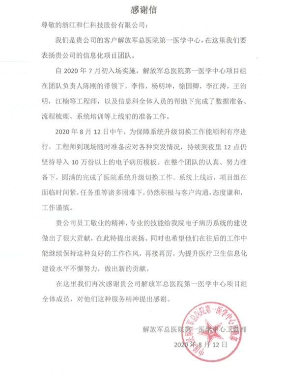 近期, 浙江和仁科技股份有限公司(以下簡(jiǎn)稱“和仁科技”)收到了來(lái)自中國(guó)人民解放軍總醫(yī)院第一醫(yī)學(xué)中心的感謝信,表?yè)P(yáng)了和仁科技的專(zhuān)業(yè)能力及在項(xiàng)目實(shí)施過(guò)程中的敬業(yè)精神。